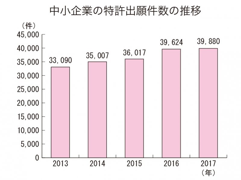 2017年の中小企業における特許出願件数は約4万件(前年比0.6%増)です(図1)。特許出願全体の約15%に
